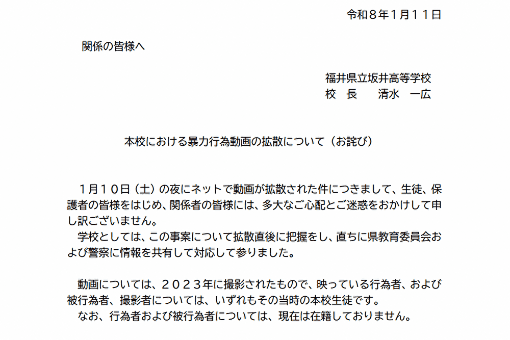 福井県立坂井高校は2026年1月11日、校内での暴力行為を収めた動画がSNS上で拡散された問題について、公式ホームページ上で声明文を公表した。