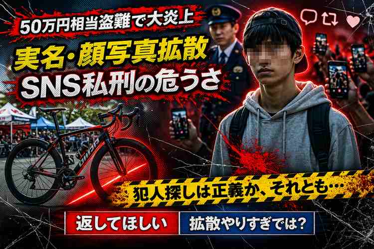 自転車イベントで約50万円相当の盗難被害を訴える投稿が拡散し、高校生とされる若い男性の実名や顔写真が広がった。確認できる範囲では、3月21日朝に投稿された被害訴えのポストは410万回以上閲覧され、反応は「返却を求める声」と「法的リスクを懸念する声」に割れている。一方で、警察の公式発表は確認できていない。盗難そのものとは別の問題として、「誰を、どこまでネットでさらしてよいのか」という線引きが問われている。