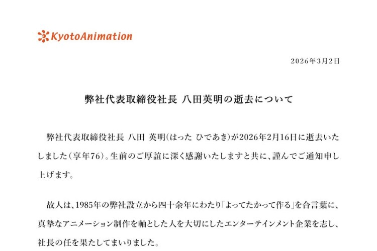 3月2日、京都アニメーションの八田英明社長が2月16日に死去していたことが公表された。享年76。京都アニメーション公式サイトは、1985年の会社設立以来四十余年にわたり、八田氏が「よってたかって作る」を合言葉に社長の任を果たしてきたというメッセージを発表した。後任には八田真一郎氏が就任した。