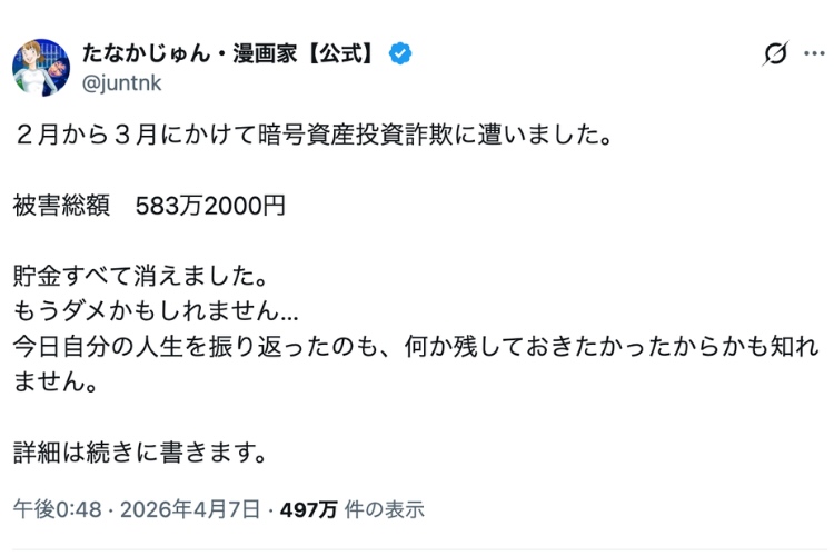 『ナッちゃん』や『学習まんが 日本の歴史』シリーズの作画などで知られる漫画家のたなかじゅん氏が4月7日、自身のXで暗号資産投資詐欺の被害に遭ったことを公表した。被害総額は583万2000円にのぼり、「貯金すべて消えました」と明かした投稿は急速に拡散。著名人による高額被害の告白として衝撃が走っただけでなく、Xで流れてくる「副業」案件が、どれほど危うい入口になり得るかを改めて浮かび上がらせた。