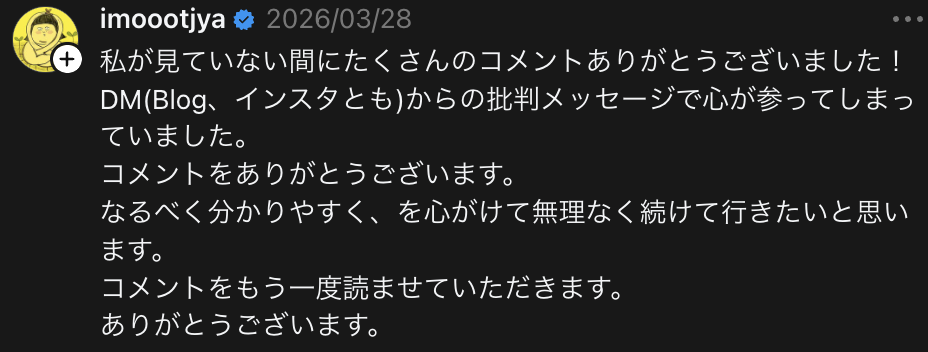 総フォロワー数44万人弱(Instagramフォロワー31.9万人、Threadsフォロワー10万人、Xフォロワー1.9万人)の影響力を持ち、livedoorブログランキング上位に入るなど注目度が高まる中で、今回のような誹謗中傷を受けるに至った。