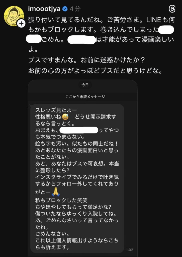 「これ以上個人情報出すようならこちらも訴えます」と、訴訟を示唆する発言などを展開。
