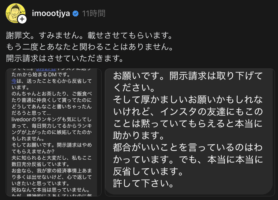加害者から謝罪DM、大盛氏は開示請求の意思表明