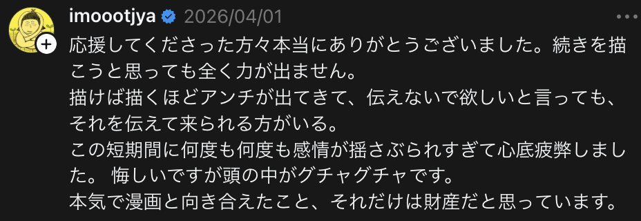 3月28日、4月1日のThreadsの投稿にて、大盛氏が誹謗中傷被害を告白、精神的に疲弊しているため漫画の更新が困難なことが伝えられた。