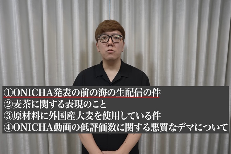 謝罪動画では「麦茶愛好家や生産者に嫌な思いをさせてしまい、本当に申し訳ございませんでした」と頭を下げた。真意は子どもにも手に取ってもらえるようなワクワクする麦茶を提供したいというものだったと説明。既存麦茶を下げる意図はなく、新しい選択肢を提案したかったと強調した。