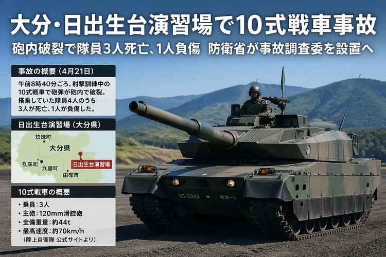 大分県の陸上自衛隊・日出生台(ひじゅうだい)演習場で21日午前、10式戦車の射撃訓練中に砲弾が砲内で暴発し、隊員3人が死亡、1人が負傷した。防衛省は原因を確認中としており、小泉防衛大臣は事故調査委員会を立ち上げて原因究明を進める考えを示した。