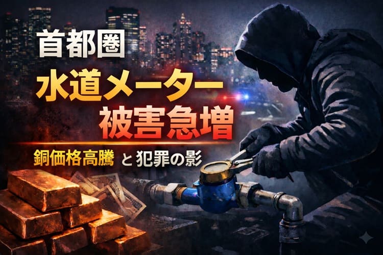 首都圏で水道メーター窃盗が急増している。2026年4月、町田市の都営住宅で31個が盗まれる被害が発覚し、住民生活に直結するインフラが標的となった。従来の金属窃盗は工事現場や発電施設が中心だったが、現在は住宅地へと拡大している。