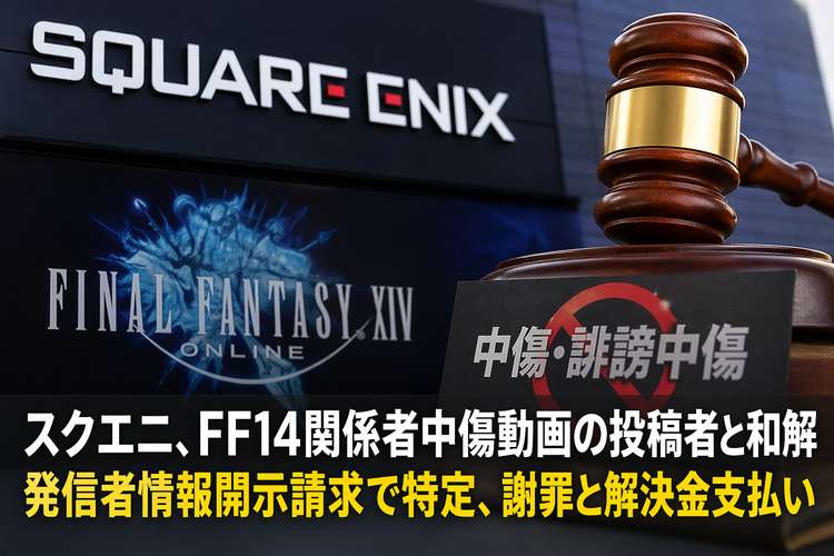 スクウェア・エニックスが4月20日、『ファイナルファンタジーXIV』関係者の社会的評価を低下させる内容を含む動画を動画共有サイトで公開していた投稿者を特定し、謝罪と解決金の支払い、今後の類似行為の禁止を含む和解に至ったと公表した。会社側によると、発信者情報開示請求をおこない、裁判所が申立てを認めた後、当該人物との協議を経て解決したという。公表時点で動画と投稿者アカウントの公開はすでに停止されている。