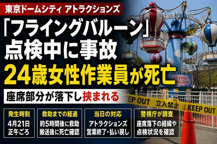 東京ドームシティ アトラクションズで4月21日、アトラクション「フライングバルーン」の点検中に24歳の女性作業員が遊具に挟まれ、死亡した。FNNプライムオンラインによると、21日正午ごろ、「体が挟まれている」と119番通報があり、東京ドームシティに勤める24歳の女性作業員が救助後に病院へ搬送されたが、まもなく死亡が確認された。