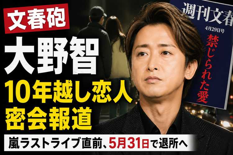 嵐の大野智をめぐり、週刊文春が4月29日、「10年越し恋人」との密会を報じた。大野は現在45歳。嵐はラストツアー「ARASHI LIVE TOUR 2026『We are ARASHI』」を開催中で、5月31日の東京ドーム公演をもってグループとしての活動を終了する予定である。大野は同日付でSTARTO ENTERTAINMENTを退所することも発表済みであり、最後の公演を前に私生活に関する報道が出た形だ。