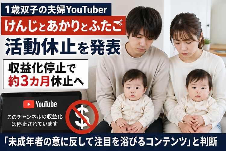 1歳の双子を育てる夫婦YouTuber「けんじとあかりとふたご」が、YouTube活動を約3カ月休止すると発表した。理由はチャンネルの収益化停止で、YouTube側から「未成年者の意に反して注目を浴びることを促すコンテンツ」と判断されたという。