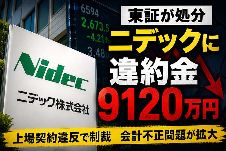 ニデックに対し、東京証券取引所が上場契約違約金9120万円を徴求する。日本取引所グループは4月30日、ニデック株式会社株式について、企業行動規範の遵守すべき事項に違反し、市場に対する株主および投資者の信頼を毀損したと認められるとして、同額の違約金を求めると発表した。ニデック株式会社は東証プライム市場に上場しており、証券コードは6594。