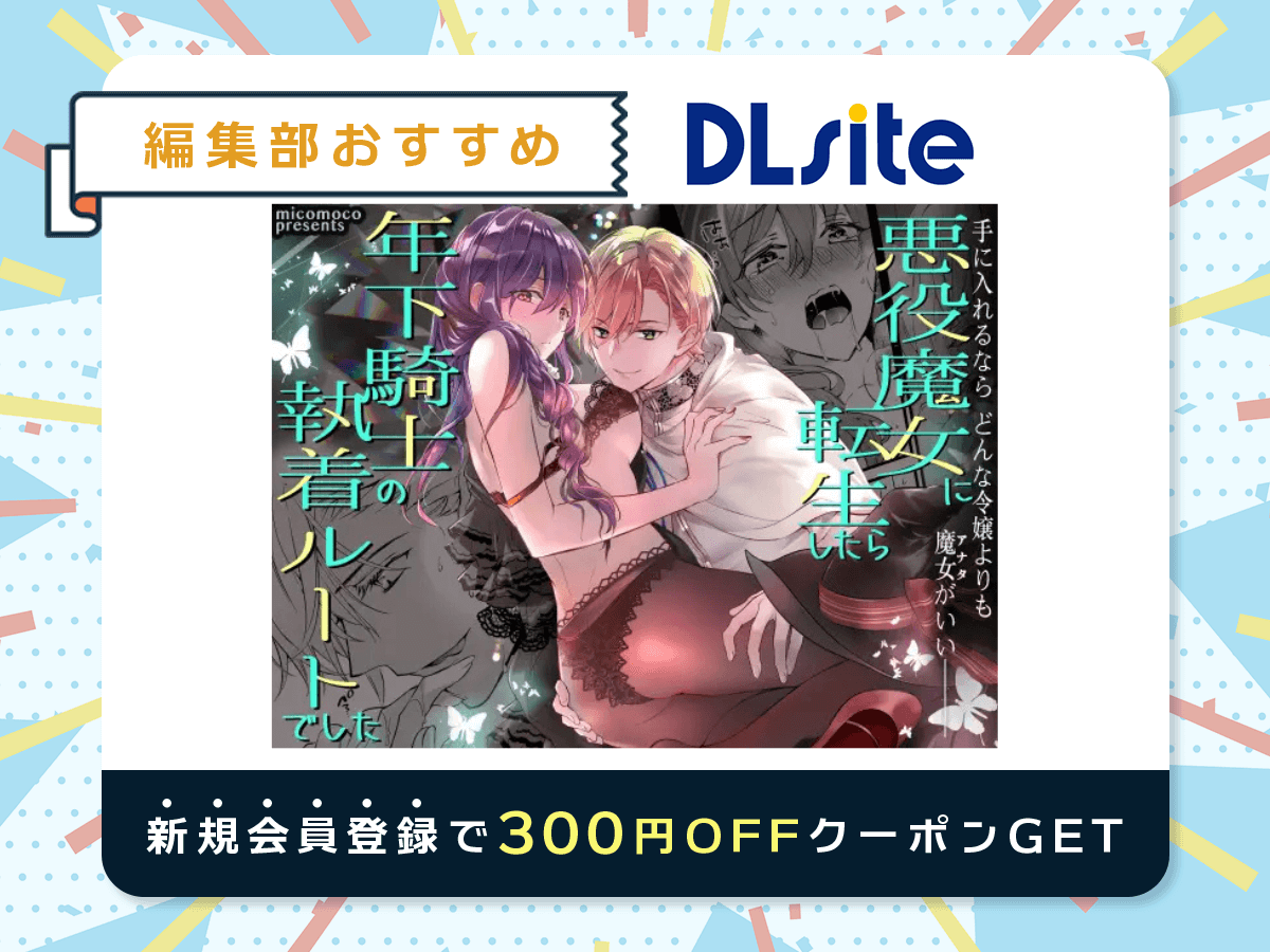 DLsiteの初回無料会員登録でもらえる300円クーポンを利用すると、『悪役魔女に転生したら年下騎士の執着ルートでした』を770円→470円で読めるので手頃な価格で読みたい人にもピッタリです。