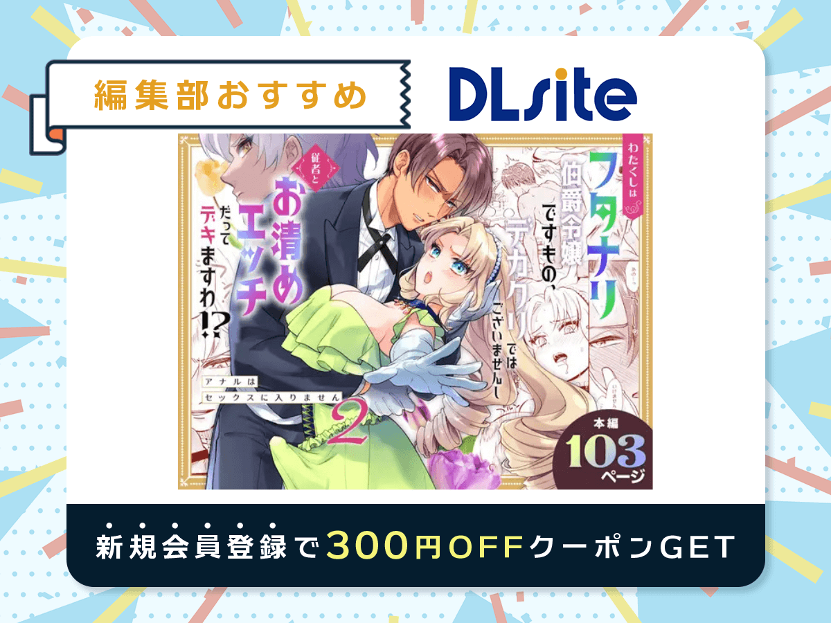 DLsiteの初回無料会員登録でもらえる300円クーポンを利用すると、『わたくしはフタナリ伯爵令嬢ですもの、デカクリではございませんし従者とお清めエッチだってデキますわ!? ~アナルはセックスに入りません2~』を1,100円→470円で読めるので手頃な価格で読みたい人にもピッタリです。