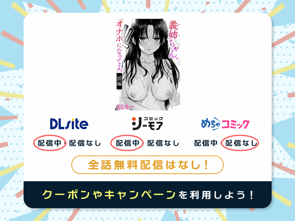 全ページを無料配信している電子書籍サービスはありませんが、初回限定クーポンやキャンペーンを利用すると『義姉ちゃん、オナホになってよ。前編』を手頃な値段で読むことができます。