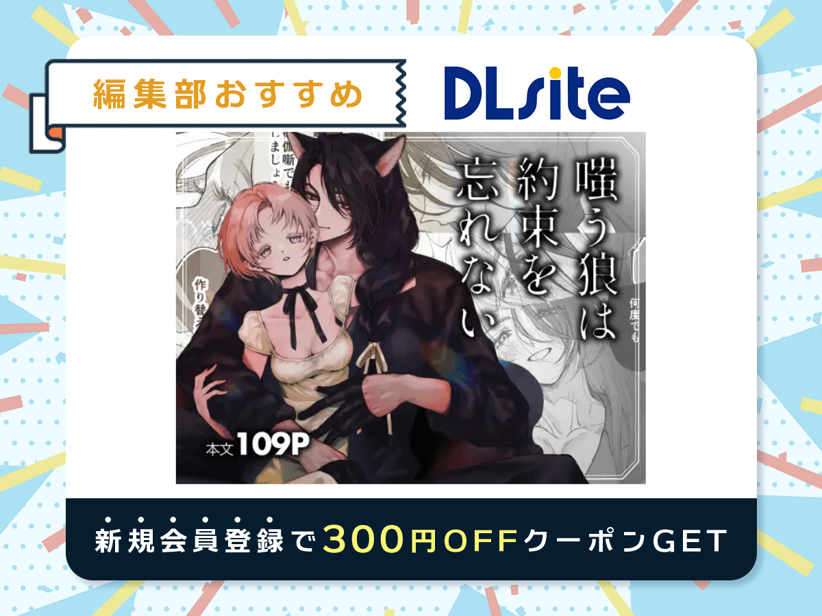DLsiteの初回無料会員登録でもらえる300円クーポンを利用すると、『嗤う狼は約束を忘れない』を880円→580円で読めるので手頃な価格で読みたい人にもピッタリです。