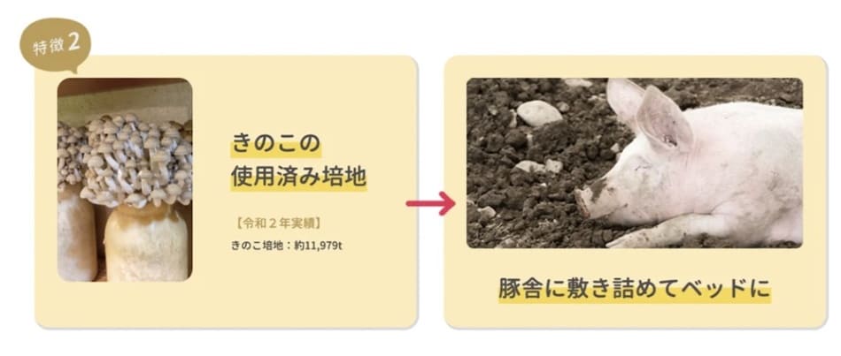 大手メーカーから出るキノコの廃培地やもみ殻を敷き詰め、発酵の力を利用した「バイオベッド」を導入。豚が本能のままに地面を掘り返すと、それが自然と攪拌され、排泄物は人の手を介さずに分解されていく。