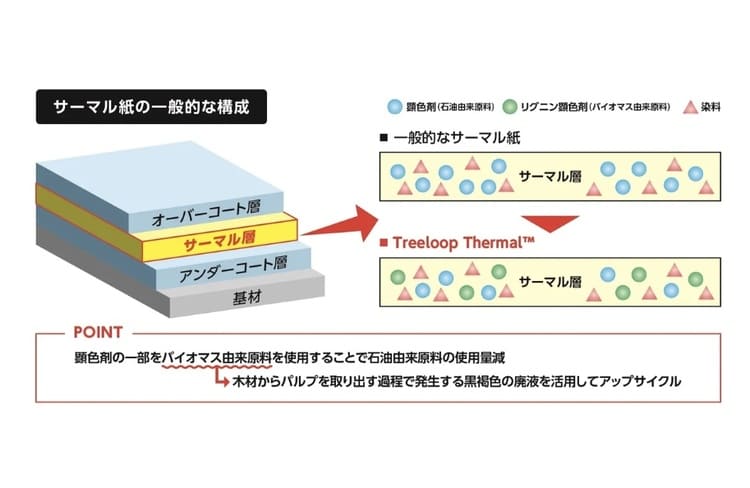 製紙工場でパルプを取り出す際に発生するこの黒液から、同社は「クラフトリグニン」を抽出。これを印字に不可欠な「顕色剤」として再利用する技術を確立した。石油由来の原料に依存してきた業界において、未利用資源をアップサイクルして付加価値を生み出す手法は、極めて実効性の高いアプローチといえる。