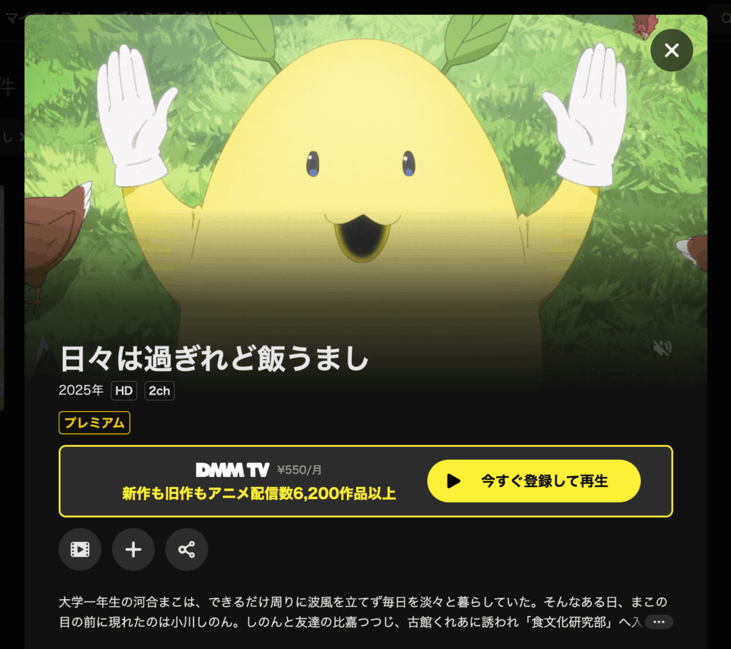 アニメ『日々は過ぎれど飯うまし』を見逃してしまった場合は、動画配信サービスのDMMTVで見るのがおすすめ!